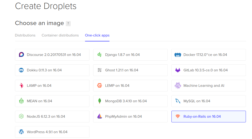 DigitalOcean is one of the favorite and cheap place to deploy your rails app. You can either create a VM and either completely configure from scratch or you can create machine specially for the targeted purpose. For this purpose i didn’t go through scratch process because i am familiar with the setup process for nginx and puma server so i chose “One-Click-Apps”. One click apps process lets you setup instantly. The available apps are Ruby on Rails, Wordpress, Discourse, phpmyAdmin etc.